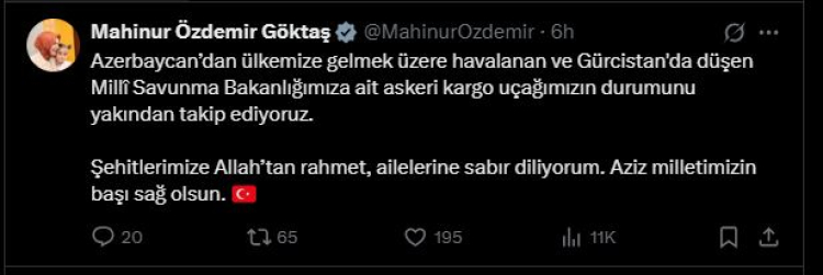 Aile ve Sosyal Hizmetler Bakanı Mahinur Özdemir Göktaş, Azerbaycan’dan Türkiye’ye gelmek üzere havalanan ve Gürcistan’da düşen Millî Savunma Bakanlığı’na ait askeri kargo uçağına ilişkin açıklamada bulundu.