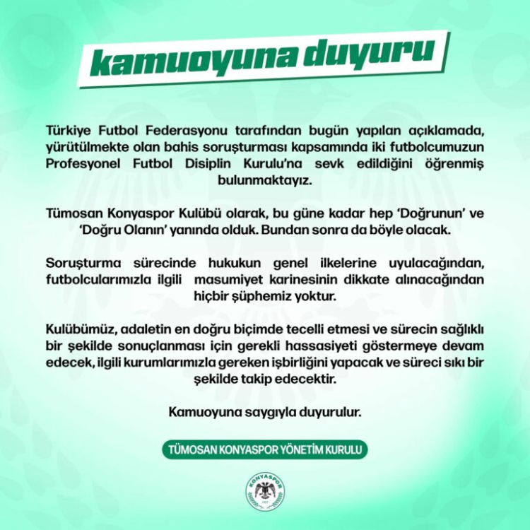 Tümosan Konyaspor, Türkiye Futbol Federasyonu tarafından yürütülen bahis soruşturması kapsamında iki futbolcusunun Profesyonel Futbol Disiplin Kurulu’na sevk edildiğini duyurdu. Kulüp, konuya ilişkin olarak “Kamuoyuna duyuru” başlıklı bir açıklama yayımladı.